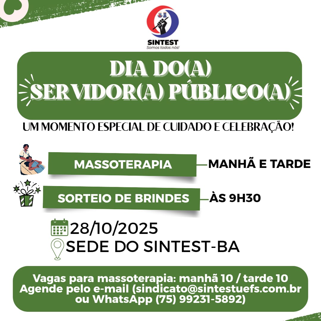 O Sintest-BA convida seus/suas associados(as) para um momento especial de cuidado e celebração em homenagem ao Dia do Servidor Público.