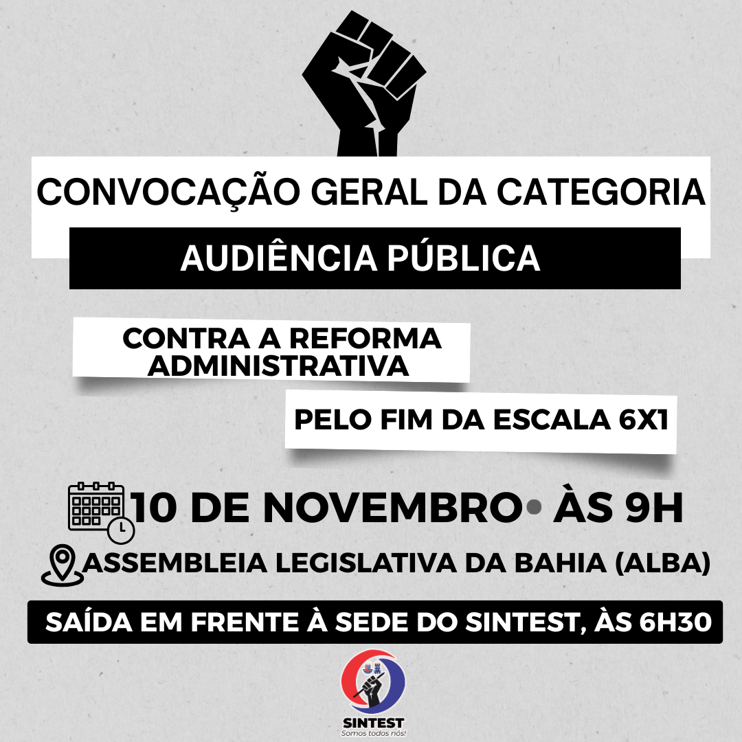 O Sintest-BA convoca a categoria para participar da Audiência Pública contra a Reforma Administrativa e pelo fim da escala 6×1